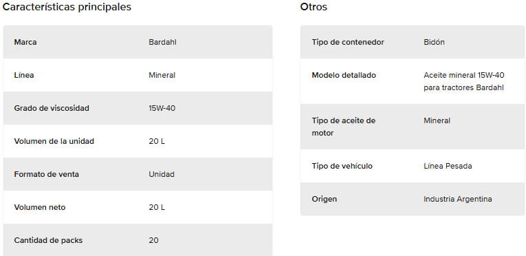 DESCRIPCIÓN DE PRODUCTOS: Reúne en un solo producto las características necesarias para la lubricación de motor, transmisión, sistema hidráulico, embrague y freno húmedo, simplificando las tareas de mantenimiento. Apto para todo tipo de maquinaria agrícola, ya sea que dispongan de un tanque común o no. Desarrollado para la lubricación de los órganos y sistemas mecánicos de tractores, segadoras-trilladoras, ensiladoras, y en general máquinas y vehículos equipados con motor diesel sobrealimentado o no. Apto para transmisiones mecánicas, convencionales (recomendación aceite API GL-4).