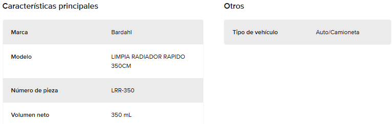 BENEFICIOS: - Evita inconvenientes en la refrigeración del motor. - Aumenta la vida útil del líquido refrigerante nuevo que se coloque. - No elimina el sarro ni las incrustaciones. - No afecta la bomba de agua ni a ningún otro componente del motor. No afecta ni mangueras ni juntas.
