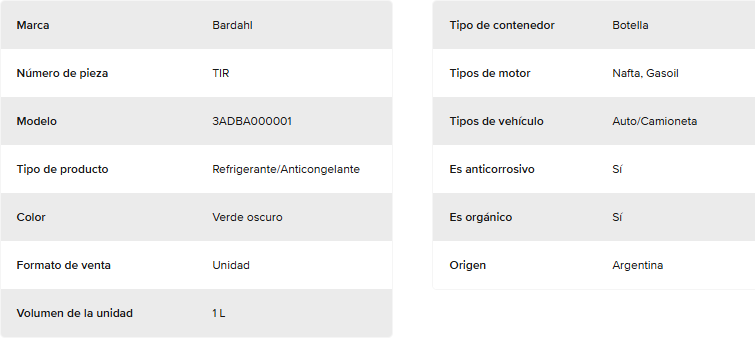 BENEFICIOS: - Protege contra posibles rajaduras o fisuras en el block de cilindros. - Provee protección a todos los metales, aluminio, cobre, hierro, acero, soldaduras, bronce, etc. - Protección por más de 250.000km. - En invierno disminuye el punto de congelamiento y en verano evita recalentamientos. - Contribuye a mejorar el medio ambiente, 100% biodegradable. - Disminuye la erosión por cavitación que afecta a las camisas de los cilindros y a la bomba de agua. - Excelente transferencia térmica. - Incorporación de Bitrex, amargante que evita la ingestión accidental especialmente en niños o animales. - Supera los requerimientos de IRAM 41368, ASTM D3306, y de las fábricas automotrices.